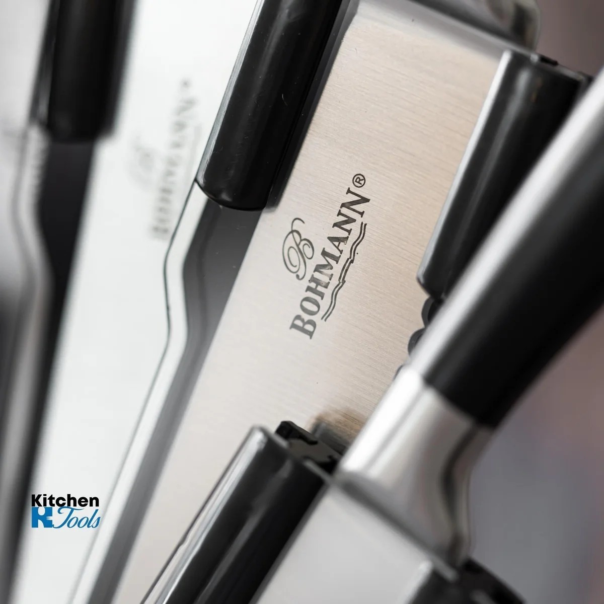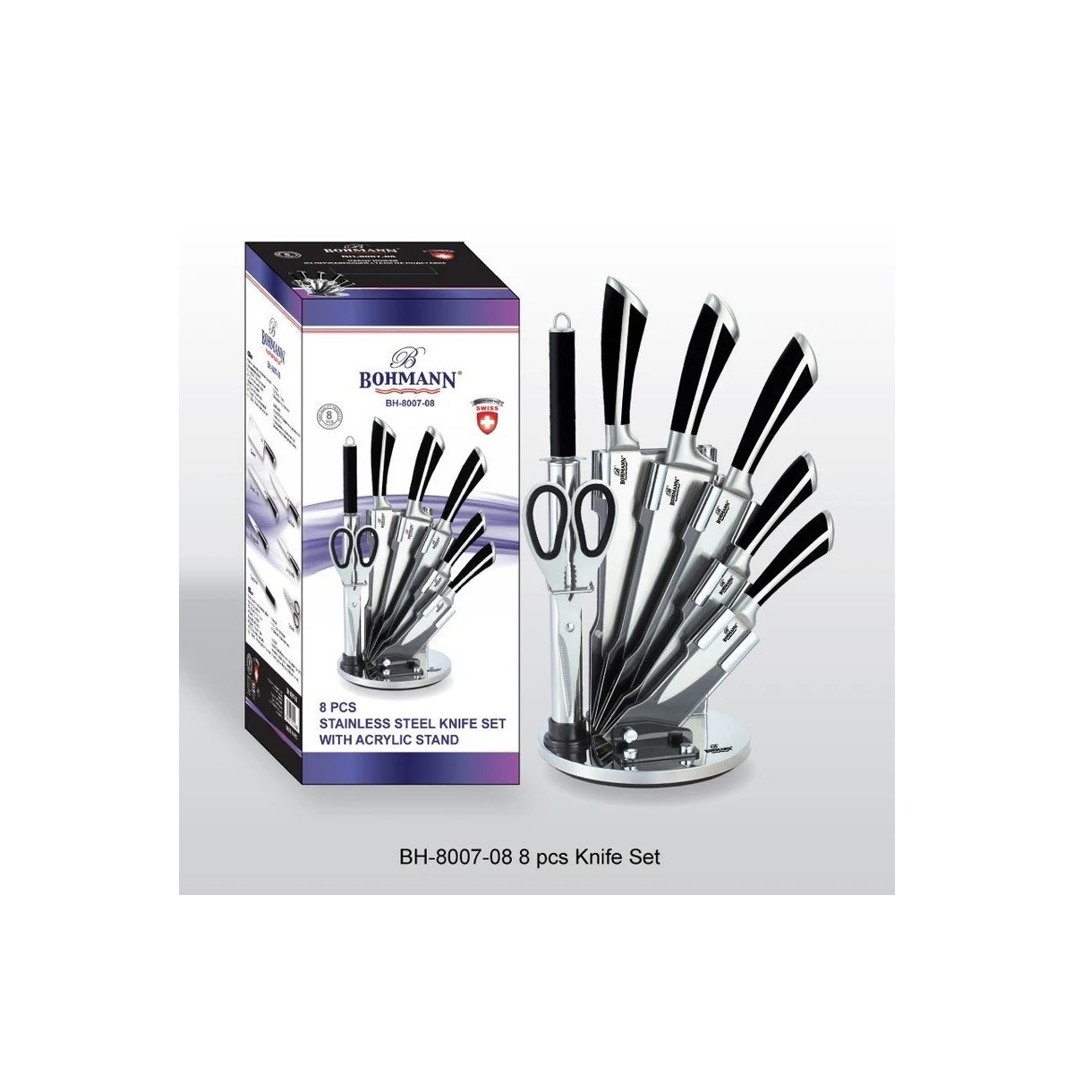 Комплектът ножове Bohmann са изковани от едно цяло парче стомана. Включва 5 ножа с различни размери, кухненска ножица, пила за заточване и елегантна поставка за съхранение. Дължината на остриетата варира между 12 cm и 22 cm. След употреба ножовете се измиват с препарат и се забърсват с кърпа.