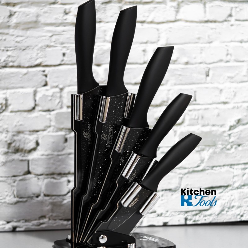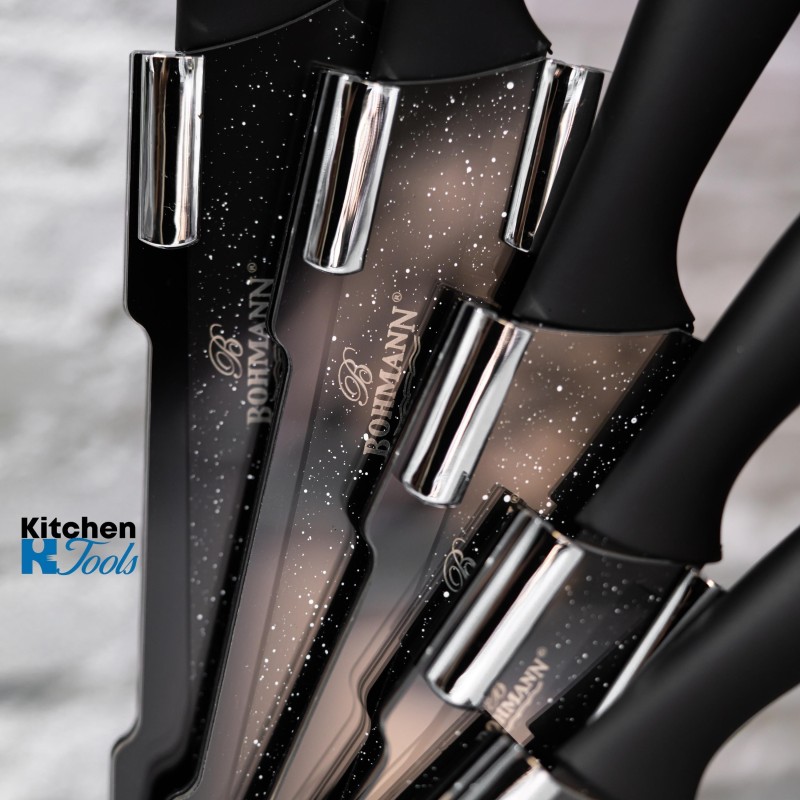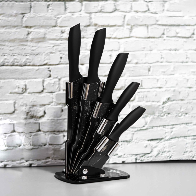 Комплект от 5 ножа Bohmann с акрилна опора, остриета от неръждаема стомана с мраморно покритие и меки на допир черни дръжки.