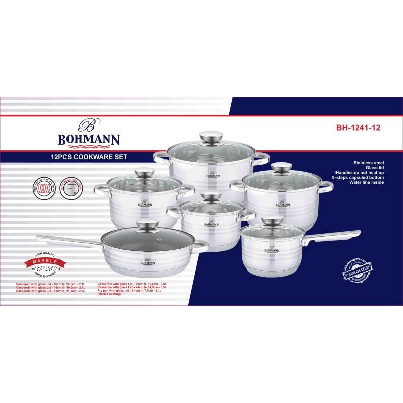 Комплект тенджери от 12 части с капаци Bohmann, дъно 9 слоя, гранитен тиган, индукция, неръждаема стомана, АВСТРИЯ