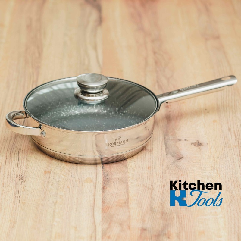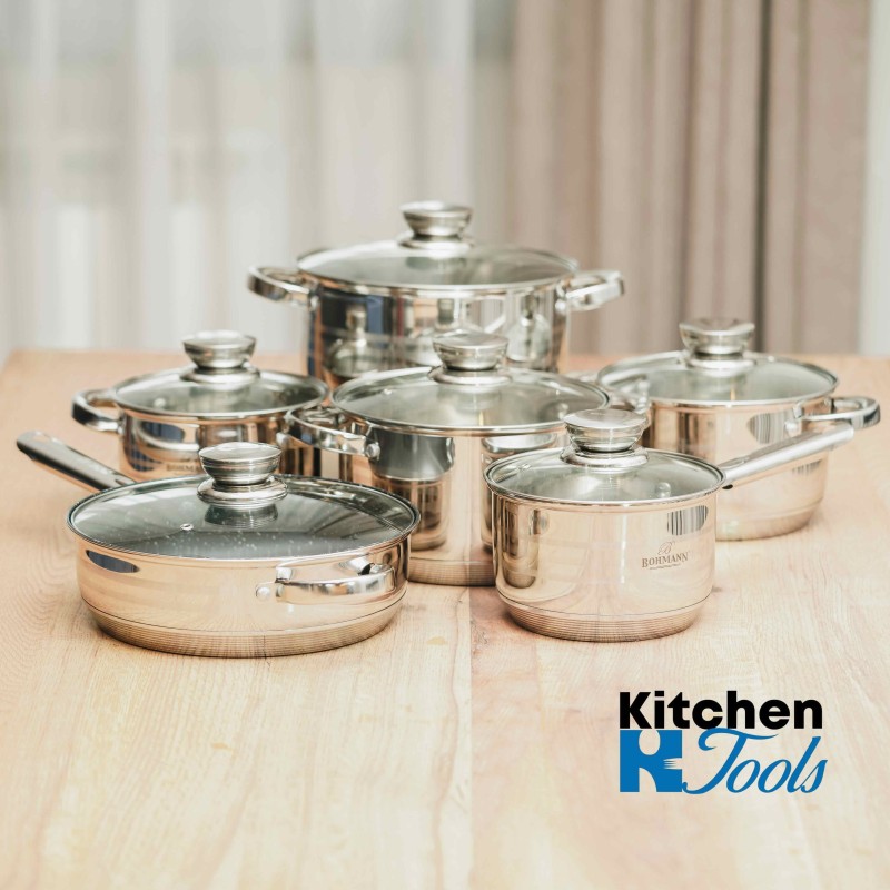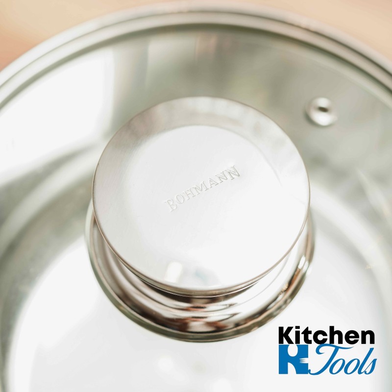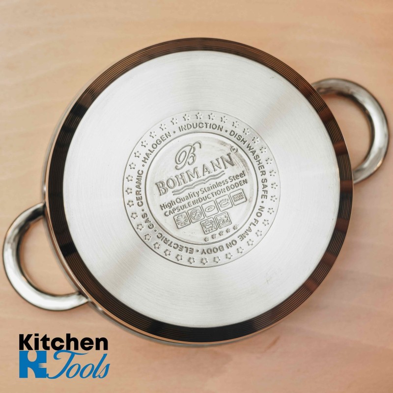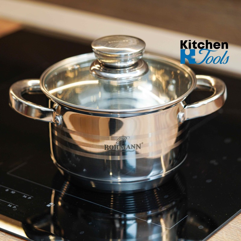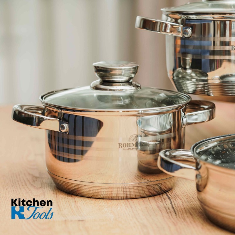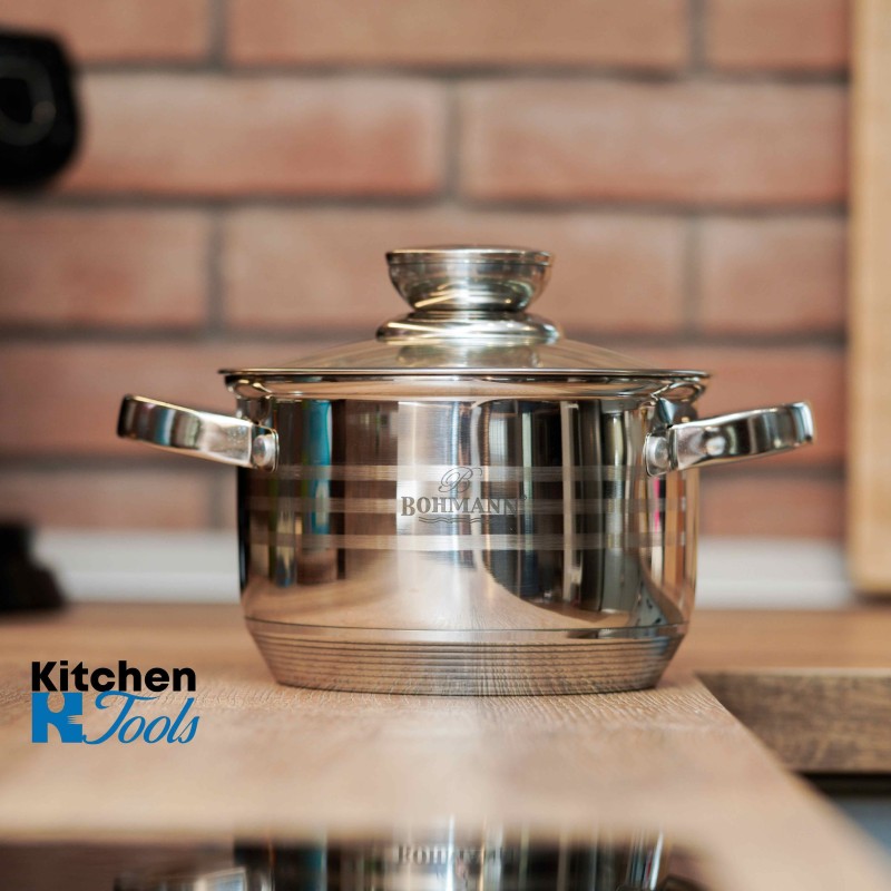 Комплектът тенджери Bohmann с капаци е изработен от висококачествена неръждаема стомана и се отличава с модерен и елегантен дизайн. Основата е капсулована и многослойна за по-добро разпределение на топлината, а извивките на ръбовете предотвратяват неприятни течове по стените на съдовете.