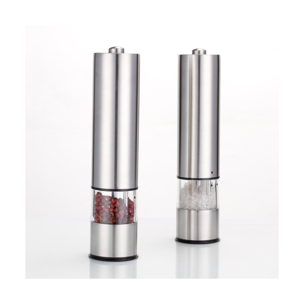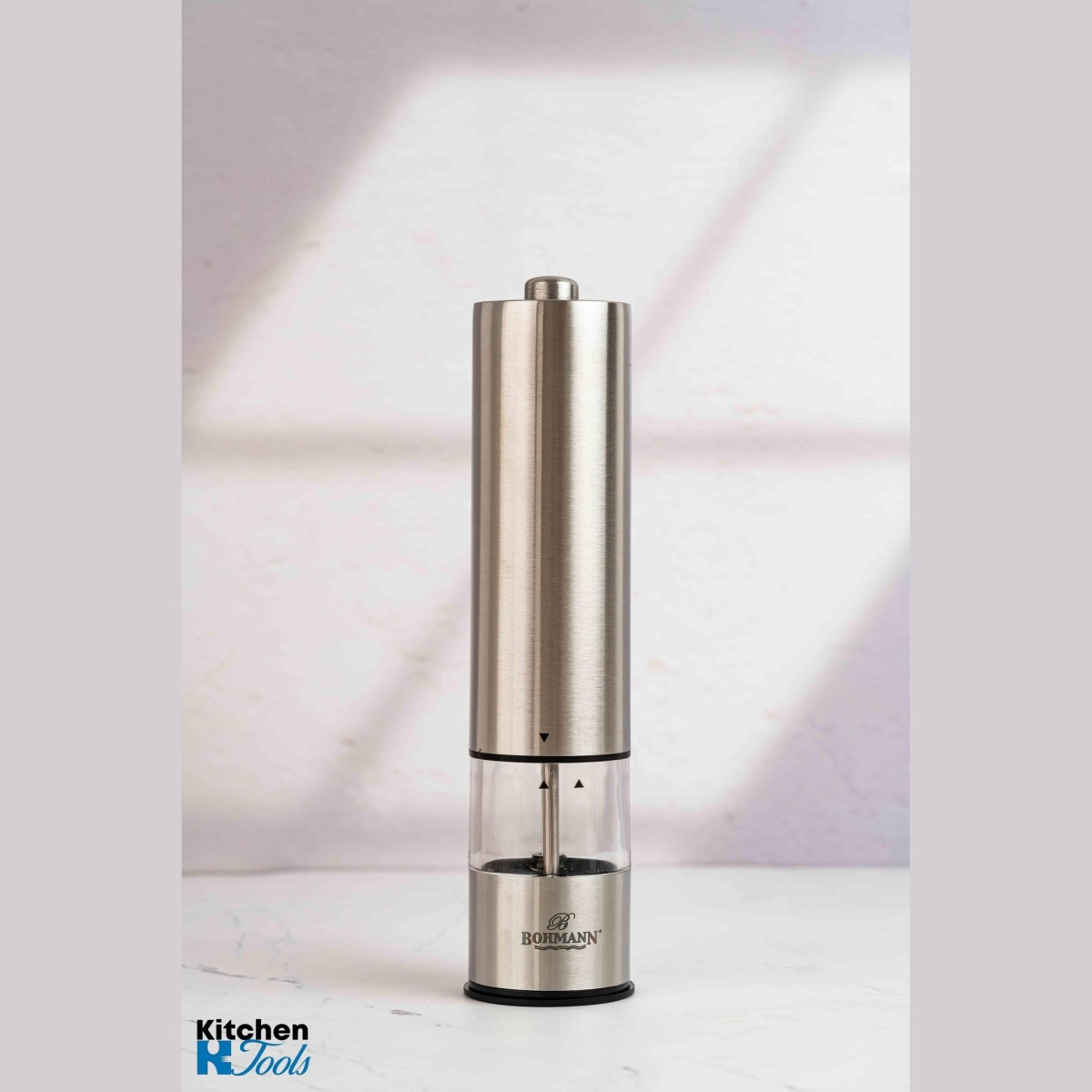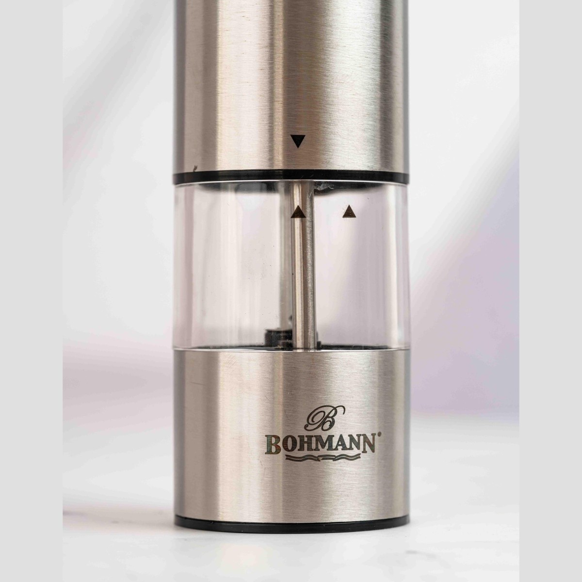 Електрическа мелничка за сол или черен пипер, Bohmann, неръждаема стомана, работа с един бутон, захранване с батерии, сребро