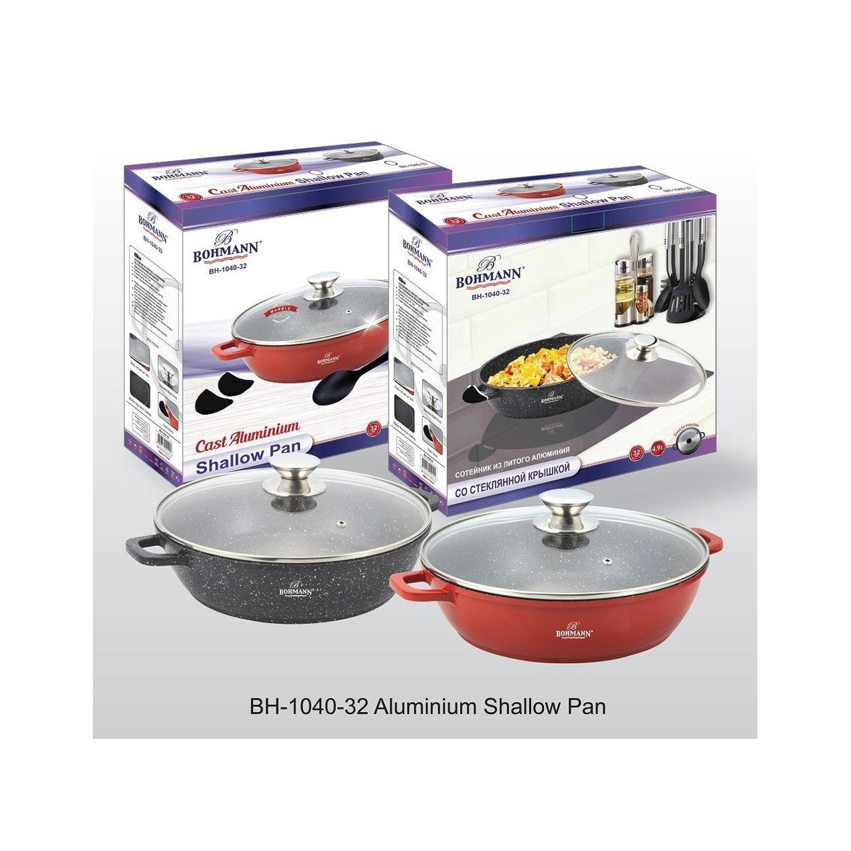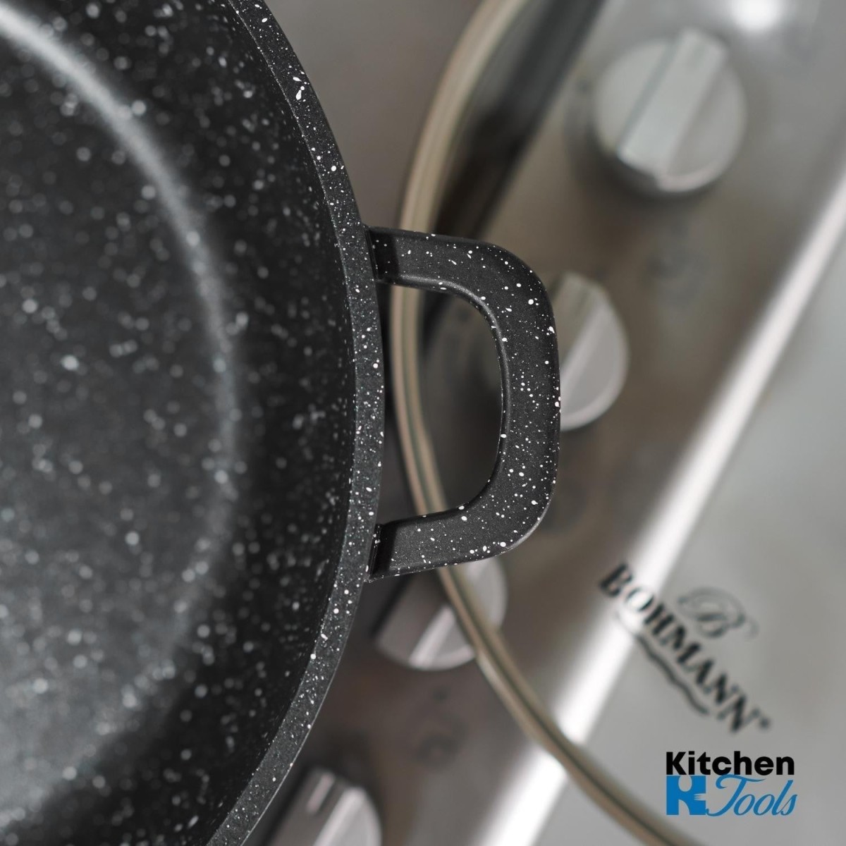 Алуминиева тенджера 32x32x8.2см с капак, мраморирана, с тефлонова лъжица, Bohmann