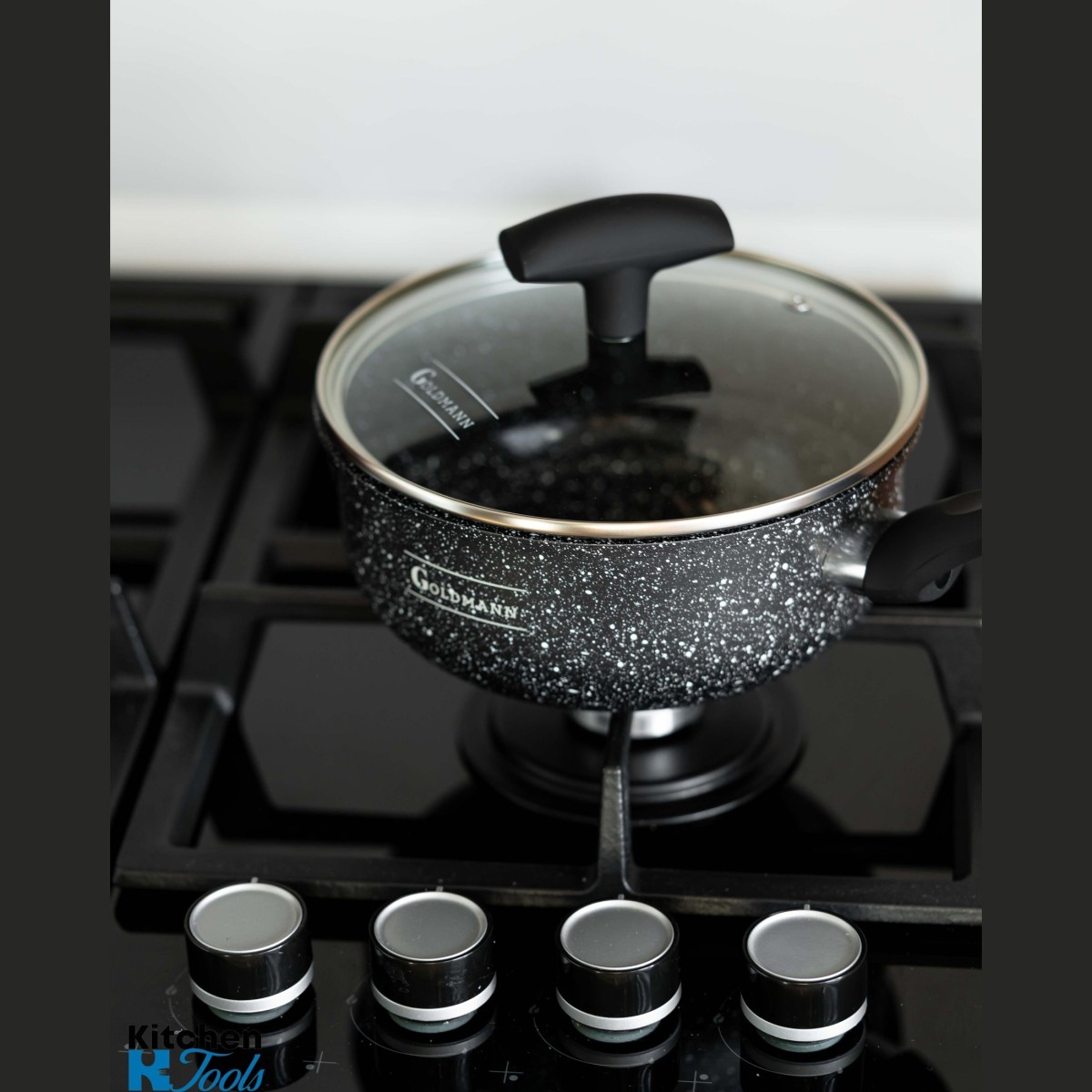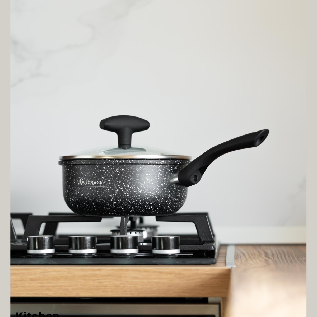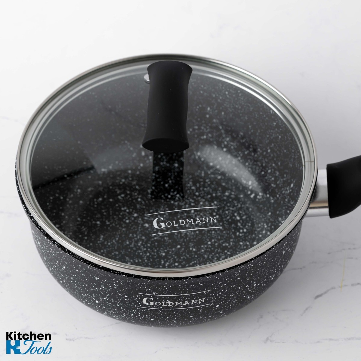 Тиган за сос, 16x6.5cm 1.1 L, керамично покритие, мека дръжка, стъклен капак, Goldmann, мрамор