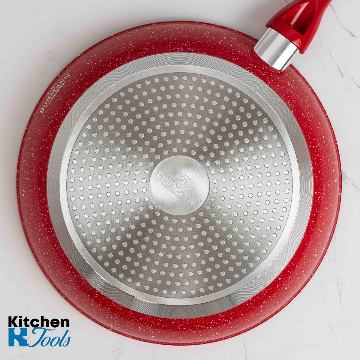 Bohmann червен мрамориран отвътре и отвън кован алуминиев тиган, 28x5,5 см, индукция, червен