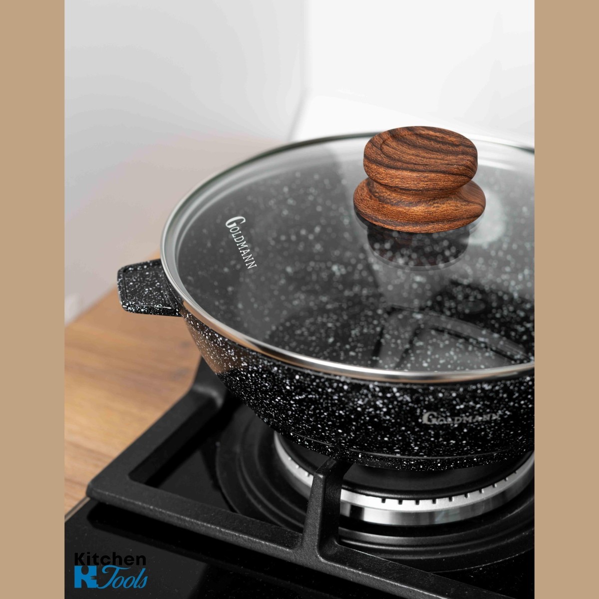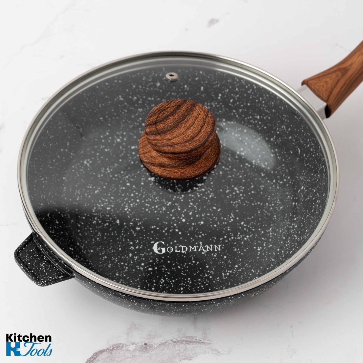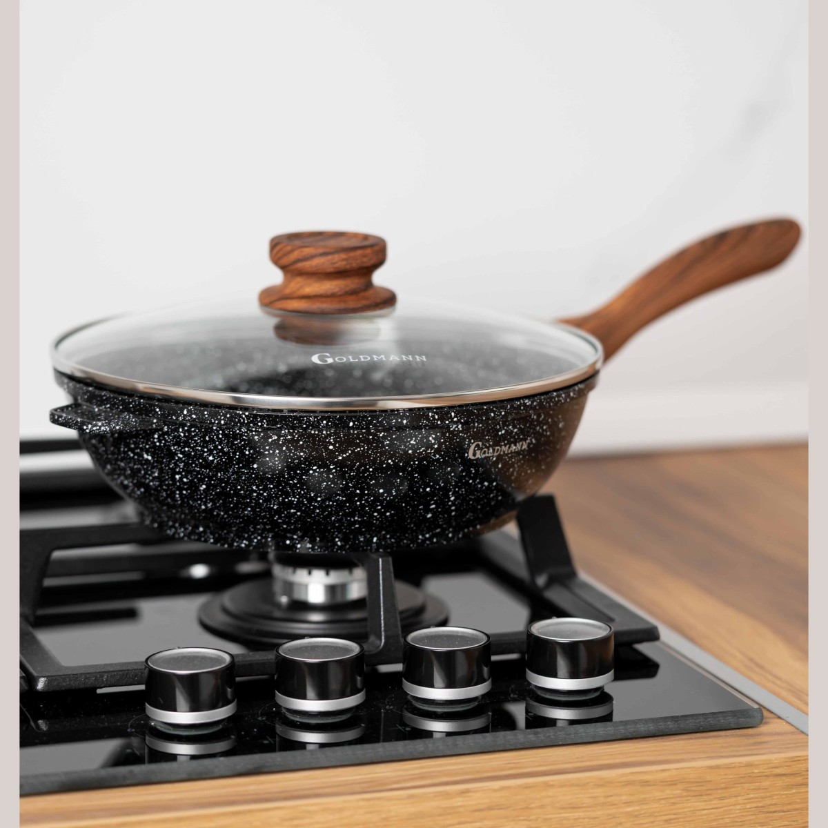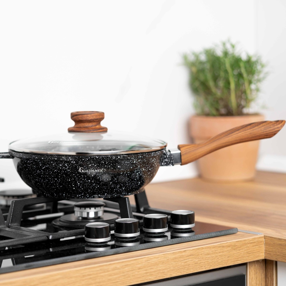 Висок лят алуминиев тиган, 24x7 см, Goldmann, термоустойчив капак, керамично покритие, мека дръжка, индукция